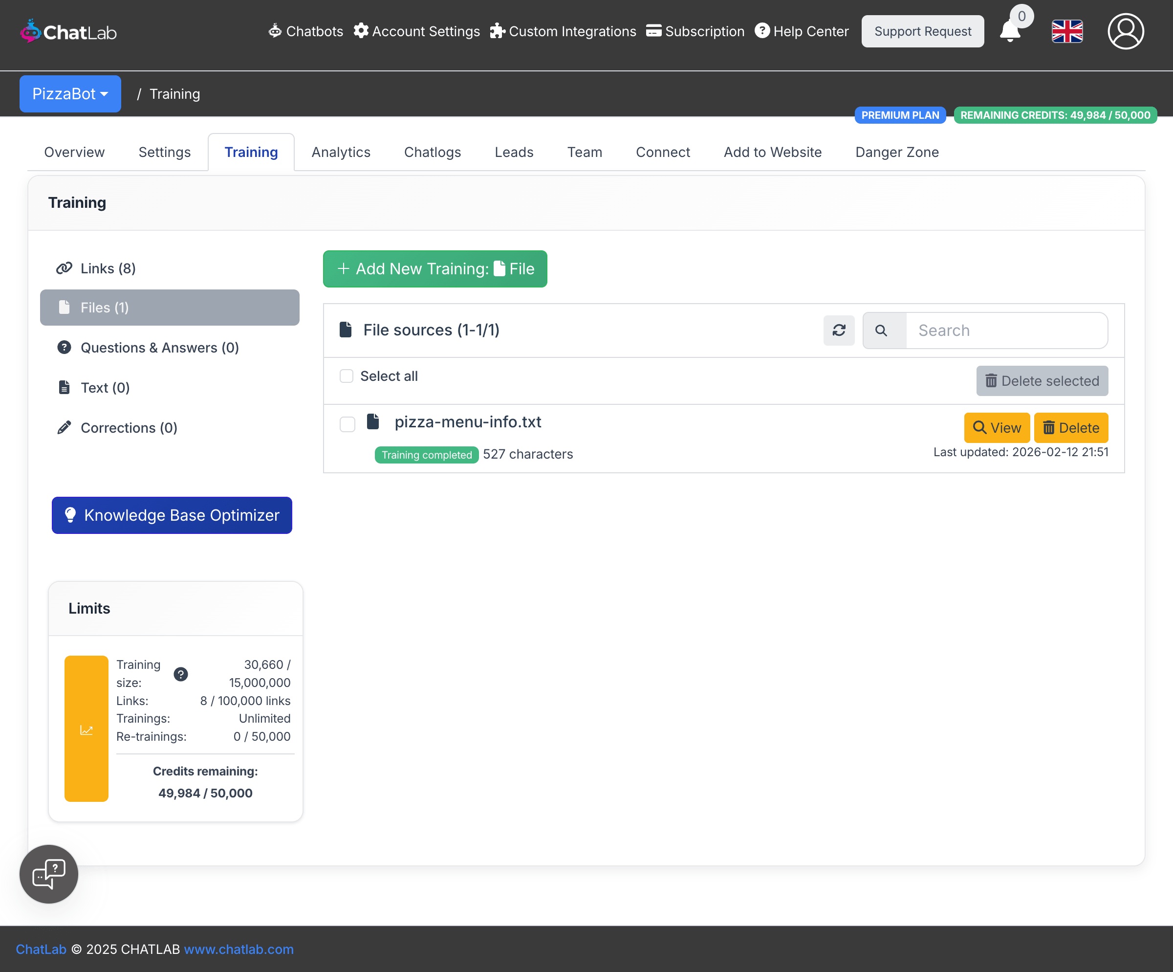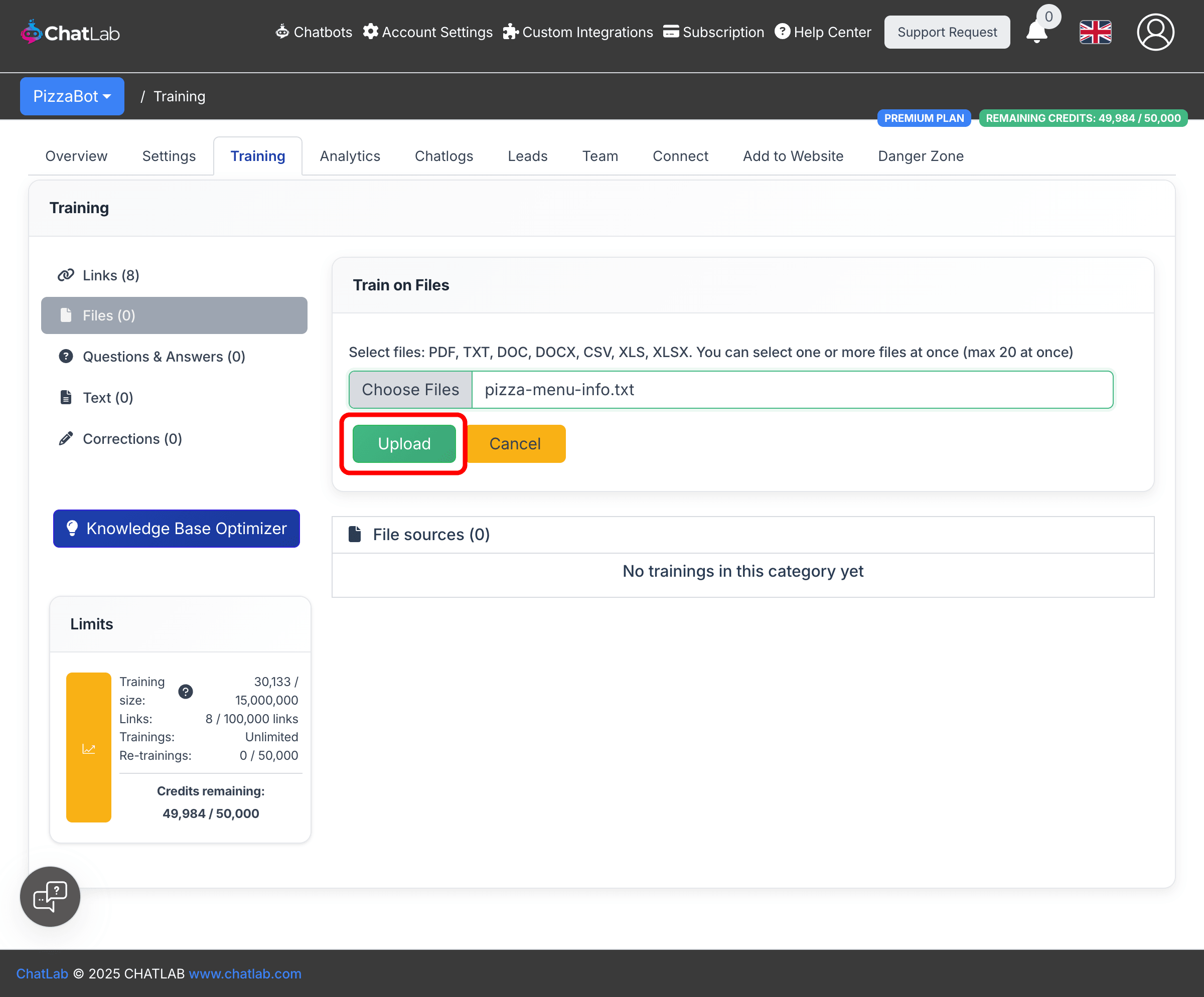 Upload files to add documents directly to your chatbot's knowledge base. ChatLab extracts text from your files, processes the content, and makes it available for the chatbot to reference when responding to user queries.