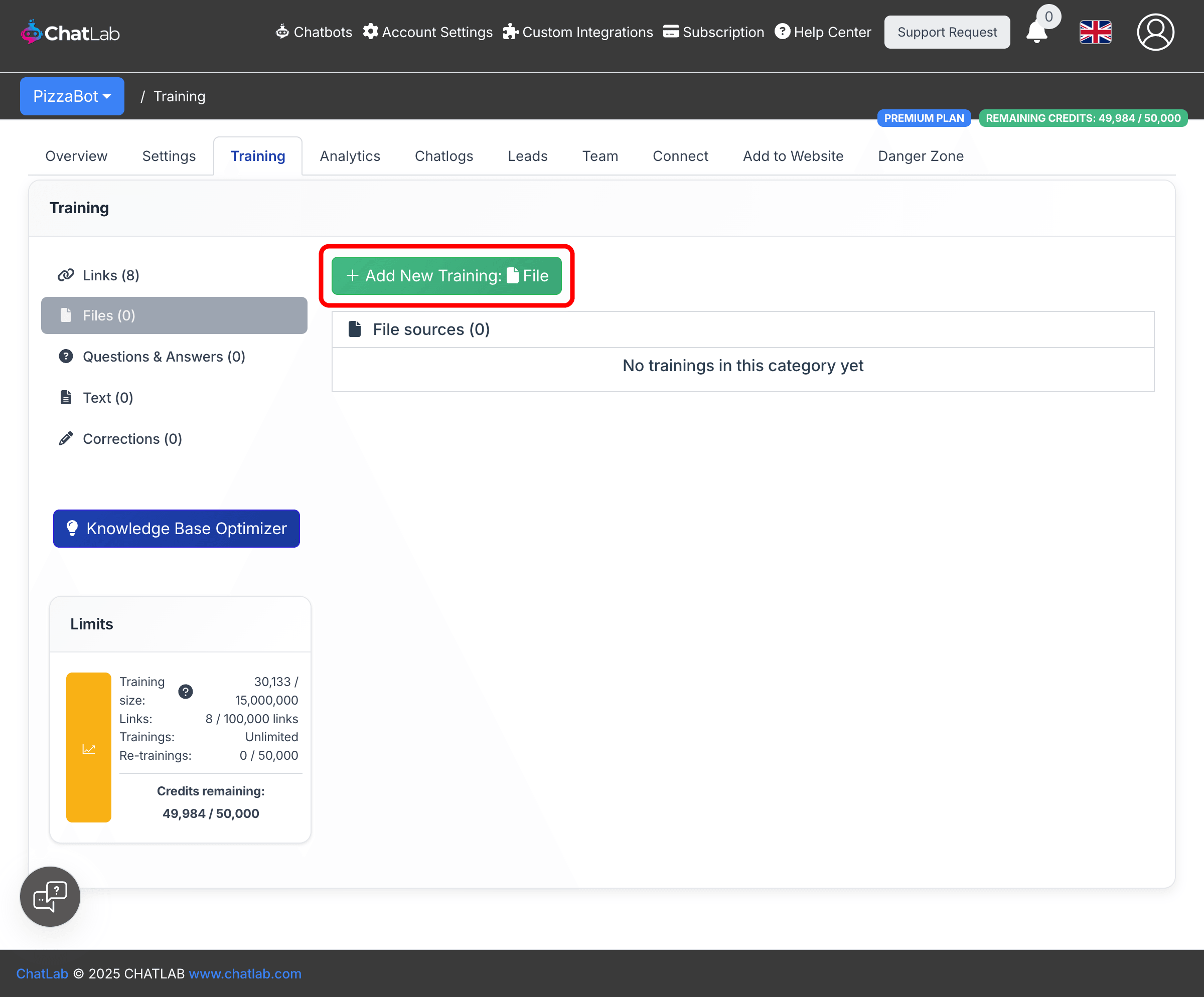 From the main menu, select Chatbots, click on your chatbot, then select the Training tab. In the left sidebar, click Files.