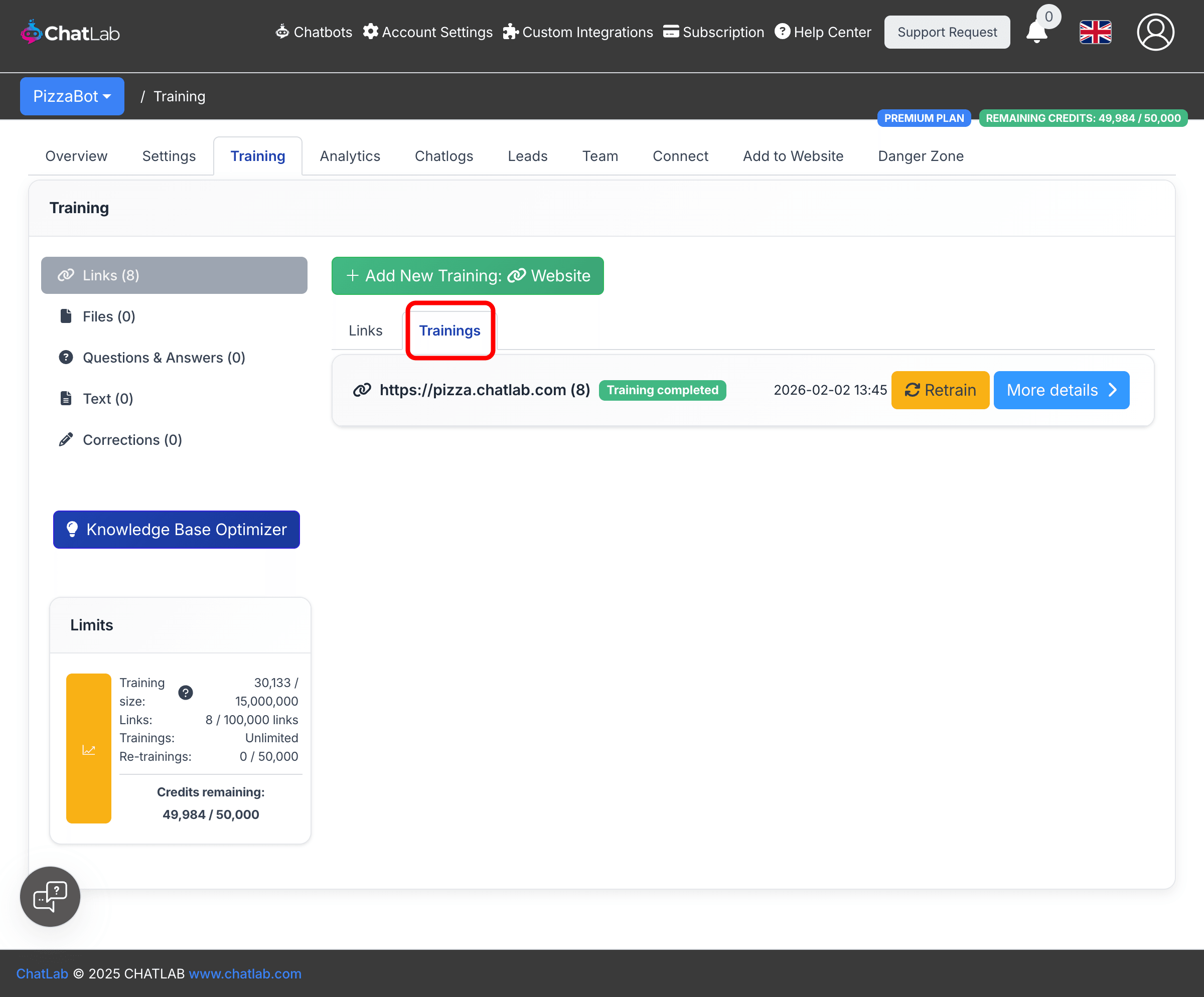 Select your chatbot, then navigate to the Training tab. In the left sidebar, choose Links. This is where you manage all website-based training sources.