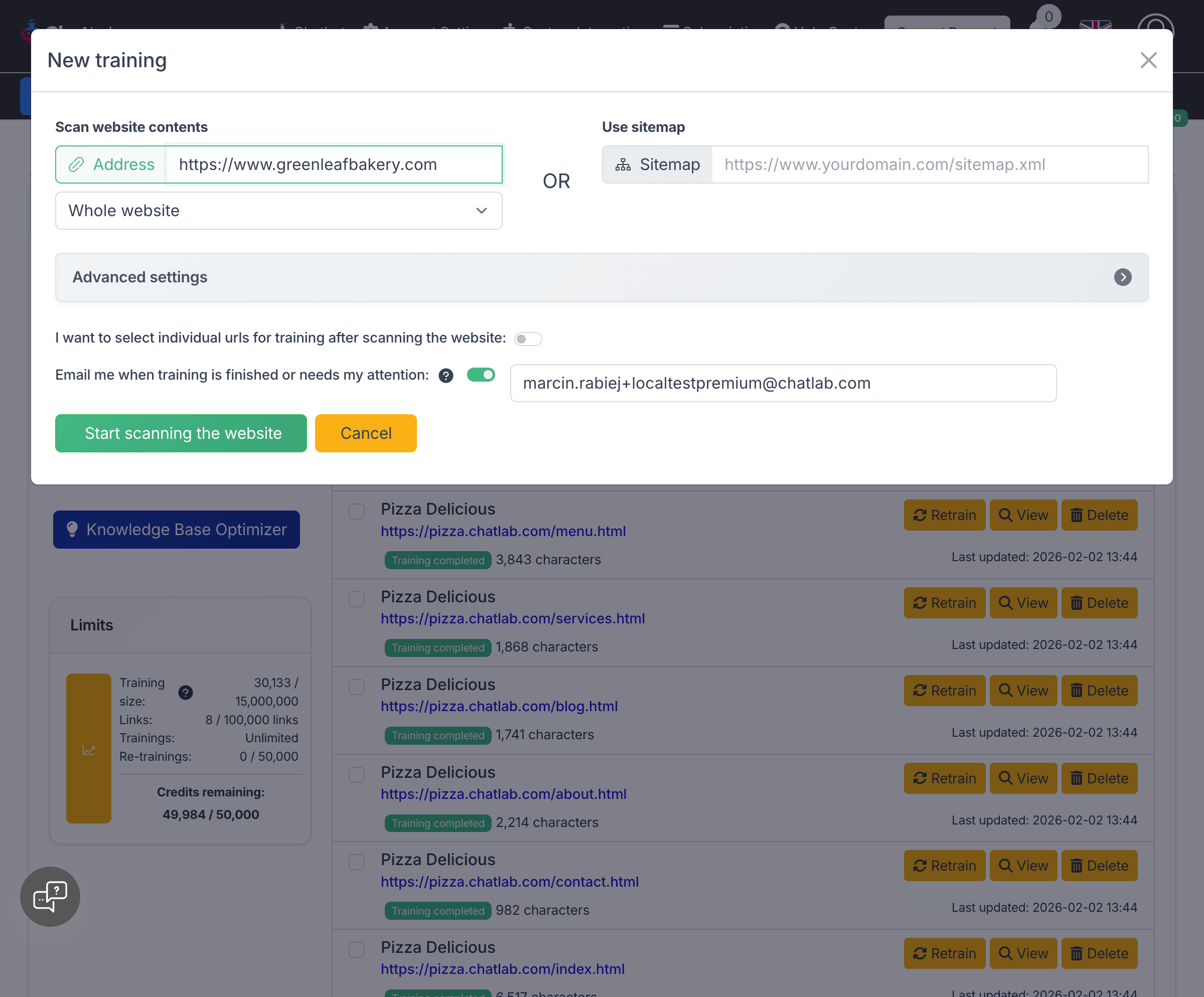 The system will crawl your website, following links to discover all pages. You can monitor progress in the Trainings tab, where you will see the number of links scanned and training characters collected in real time.