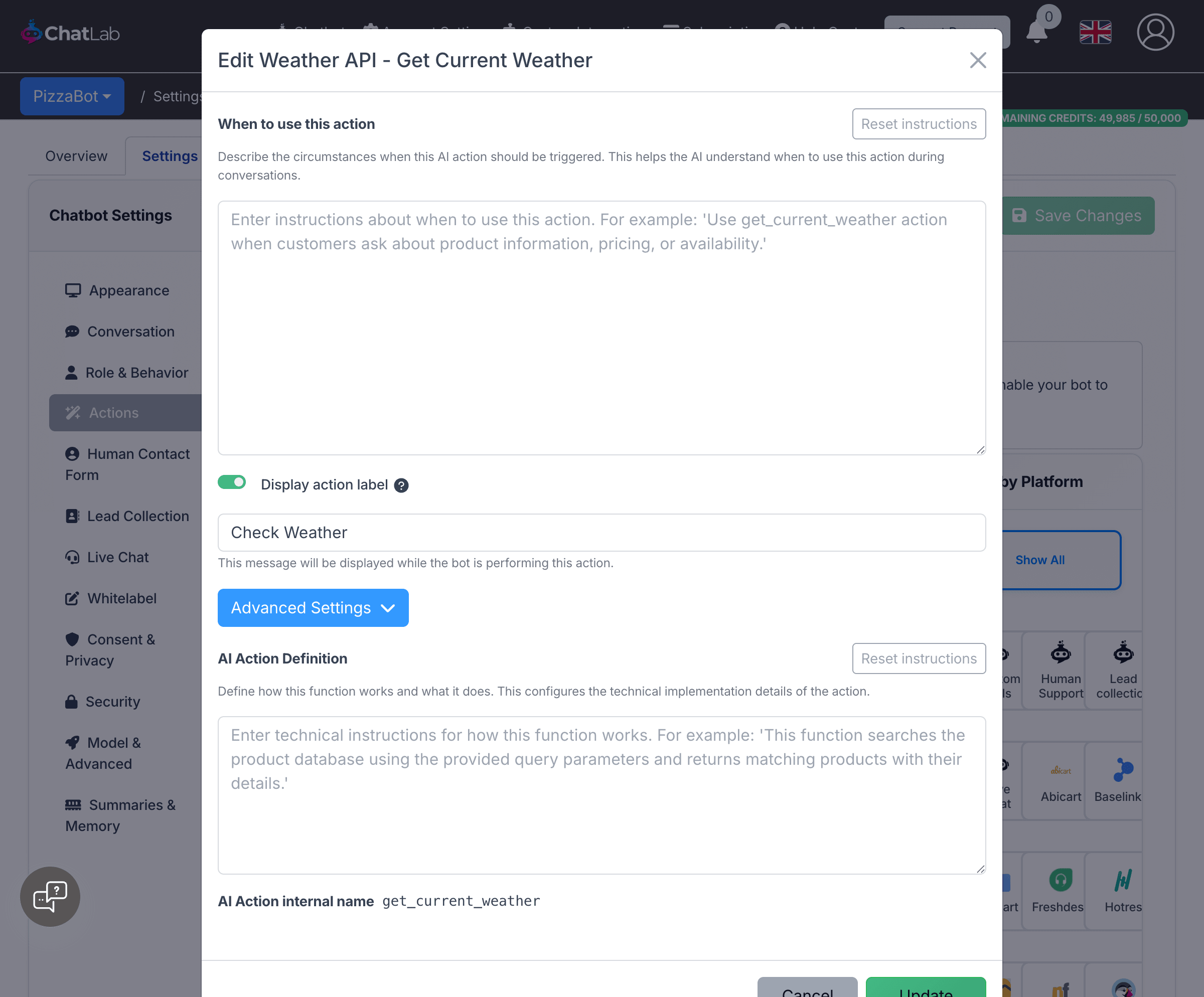 When writing the AI Action Definition for custom actions, focus on describing what the function does and which parameters the chatbot should collect from the conversation. Do not repeat integration details (URL, headers, authentication) that are already configured in the Custom Integrations page.