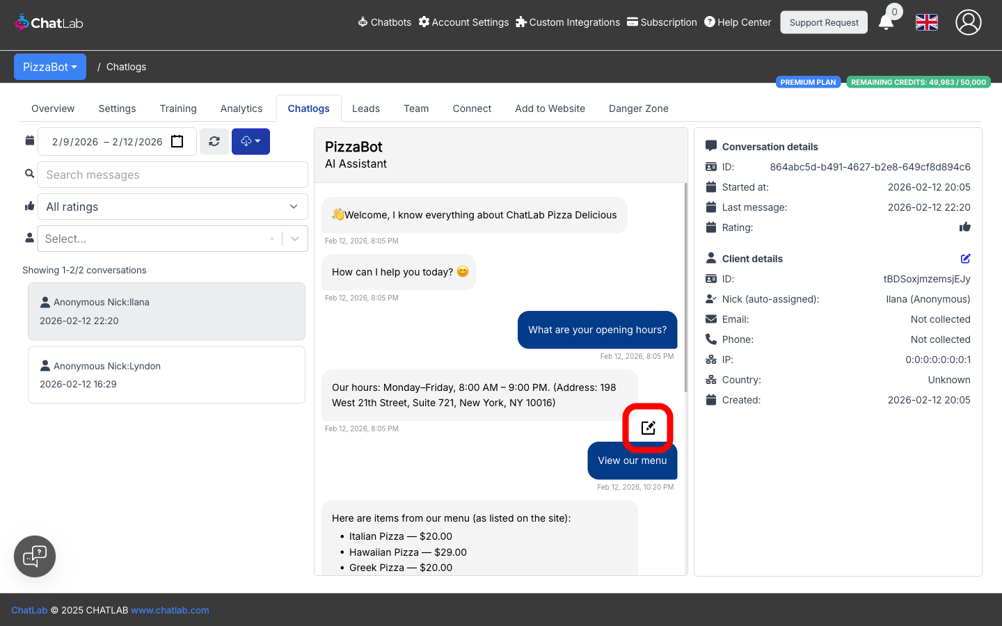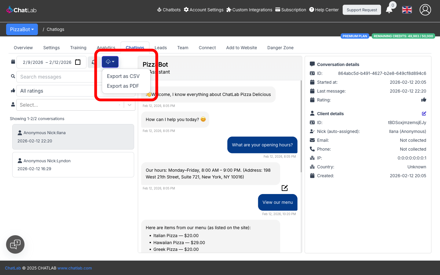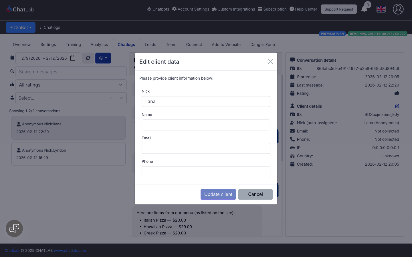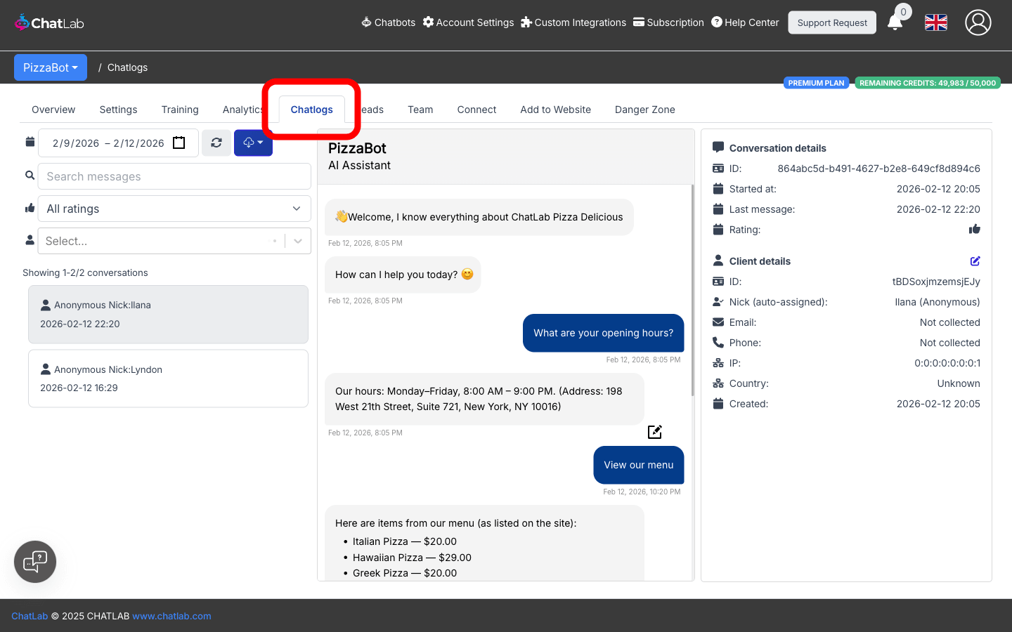 Chatlogs lets you review every conversation your chatbot has had with visitors. You can browse message history, inspect client details, filter and search conversations, export data, and add corrections to improve future responses. This data is kept safe and protected -- it is collected solely to help you identify and diagnose potential issues with your chatbot and to gain deeper insights into your customer base for better strategic planning.