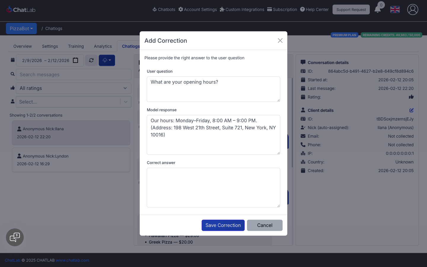 When you spot an incorrect or improvable bot response, you can add a correction directly from Chatlogs. Click the edit icon in the bottom-right corner of any bot response.