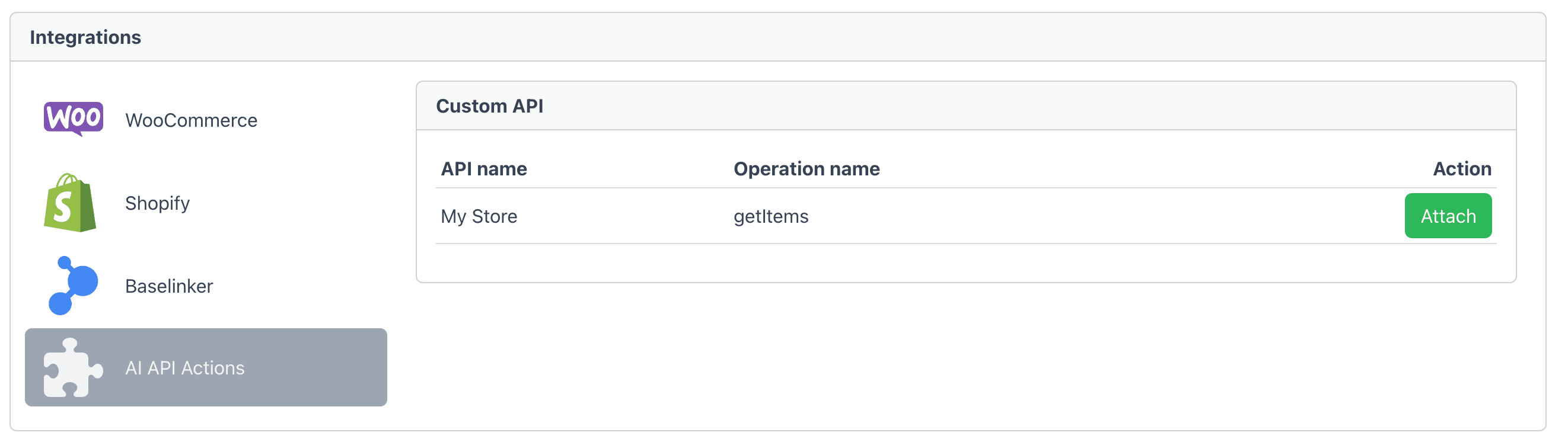 When you have the API Operations defined it is time to assign them to the chatbot. Select the chatbot in the main chatbots dashboard, click **Integrations ** and select **AI API Actions **in the left menu