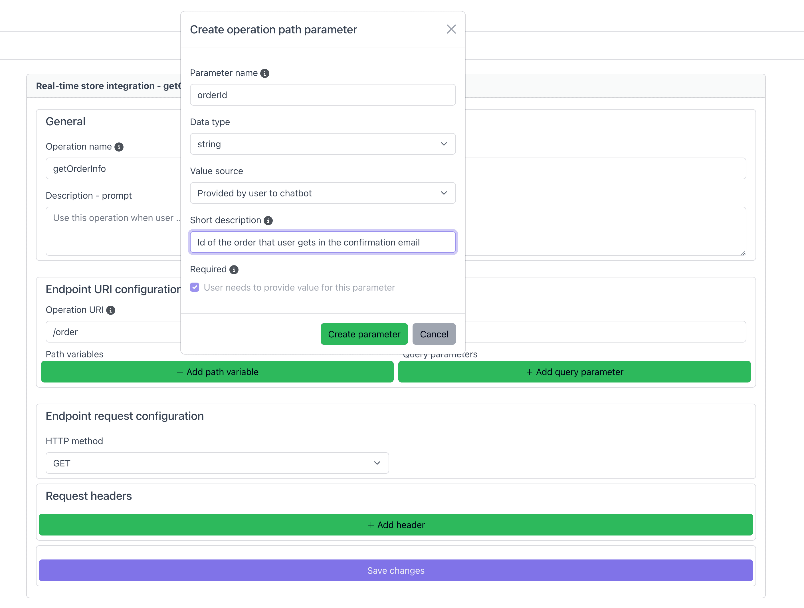 Integrating a custom API allows your chatbot to communicate with external services - for example your custom store, fetching data, or performing actions on behalf of the user.