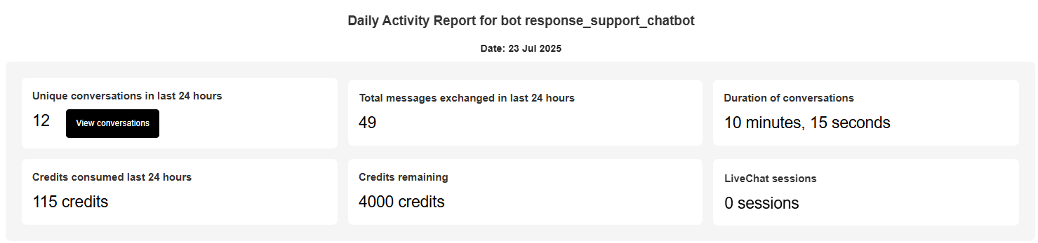 Inside the email, you'll find a concise summary of your chatbot's activity over the last 24 hours. This includes valuable data such as the number of unique conversations and the total messages exchanged, providing you with insight into how supportive your chatbot has been.