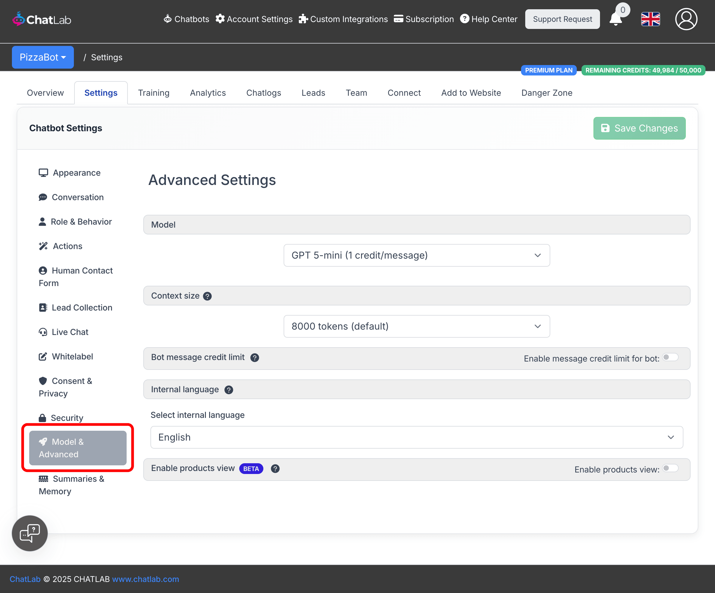 Select your chatbot, click the Settings tab, then select Model & Advanced in the left sidebar.