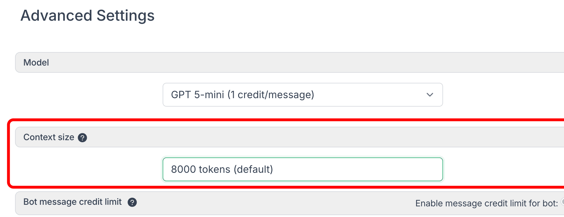 The default context size is 8,000 tokens. Increasing it affects how many message credits each interaction consumes: