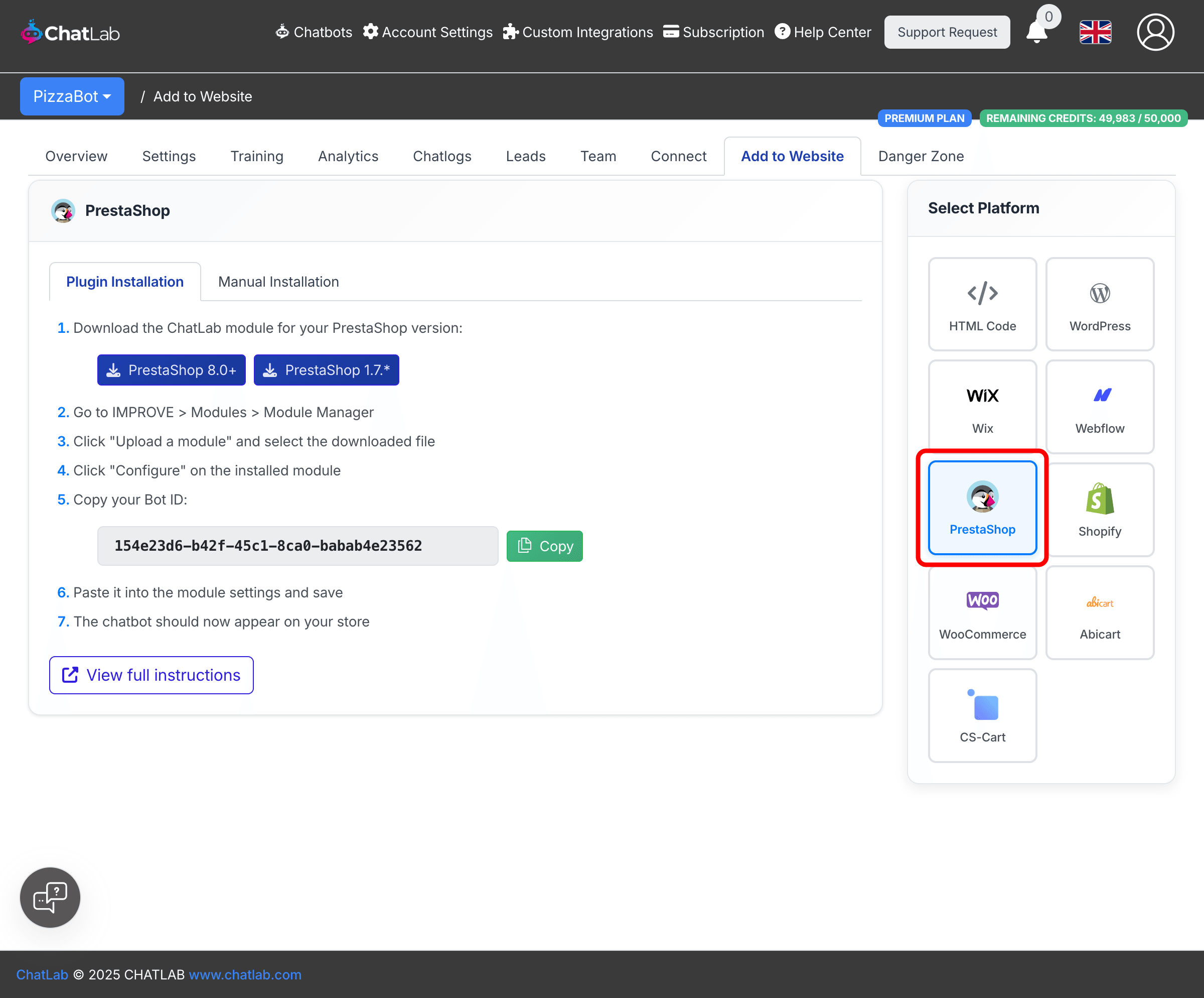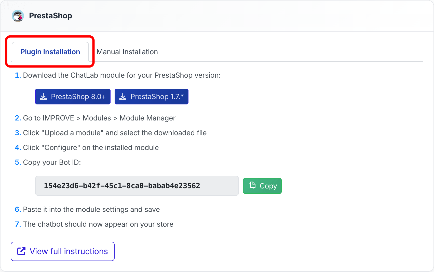 There are two ways to add a ChatLab chatbot to your PrestaShop store: installing the ChatLab module (recommended) or manually pasting the script code into your theme.
