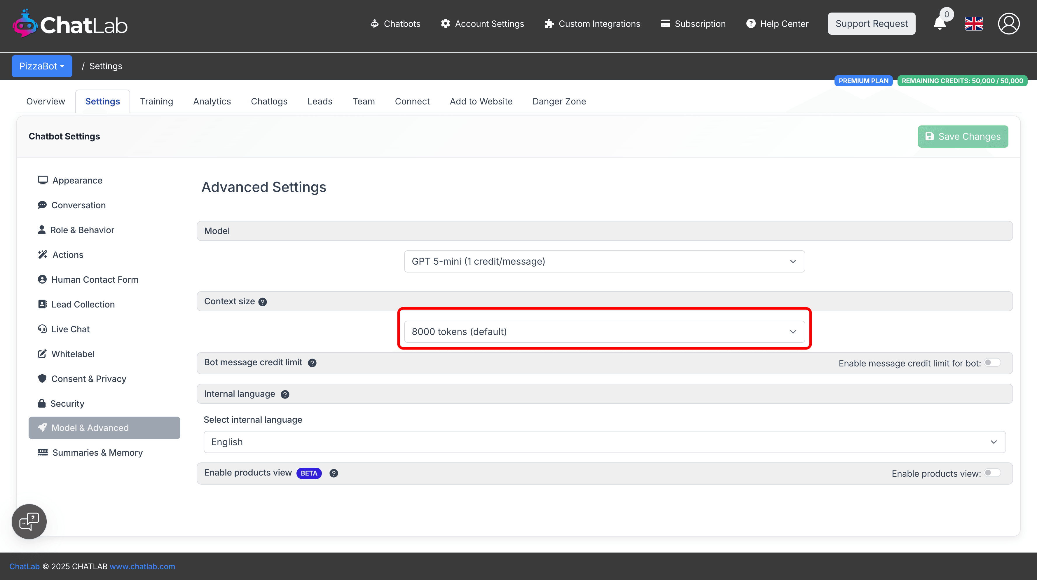 ChatLab offers three different context sizes: 8,000, 16,000, or 32,000 tokens, directly impacting the chatbot's ability to retain and utilize information. Choosing the appropriate context size is a balance between desired response quality and operational budget.