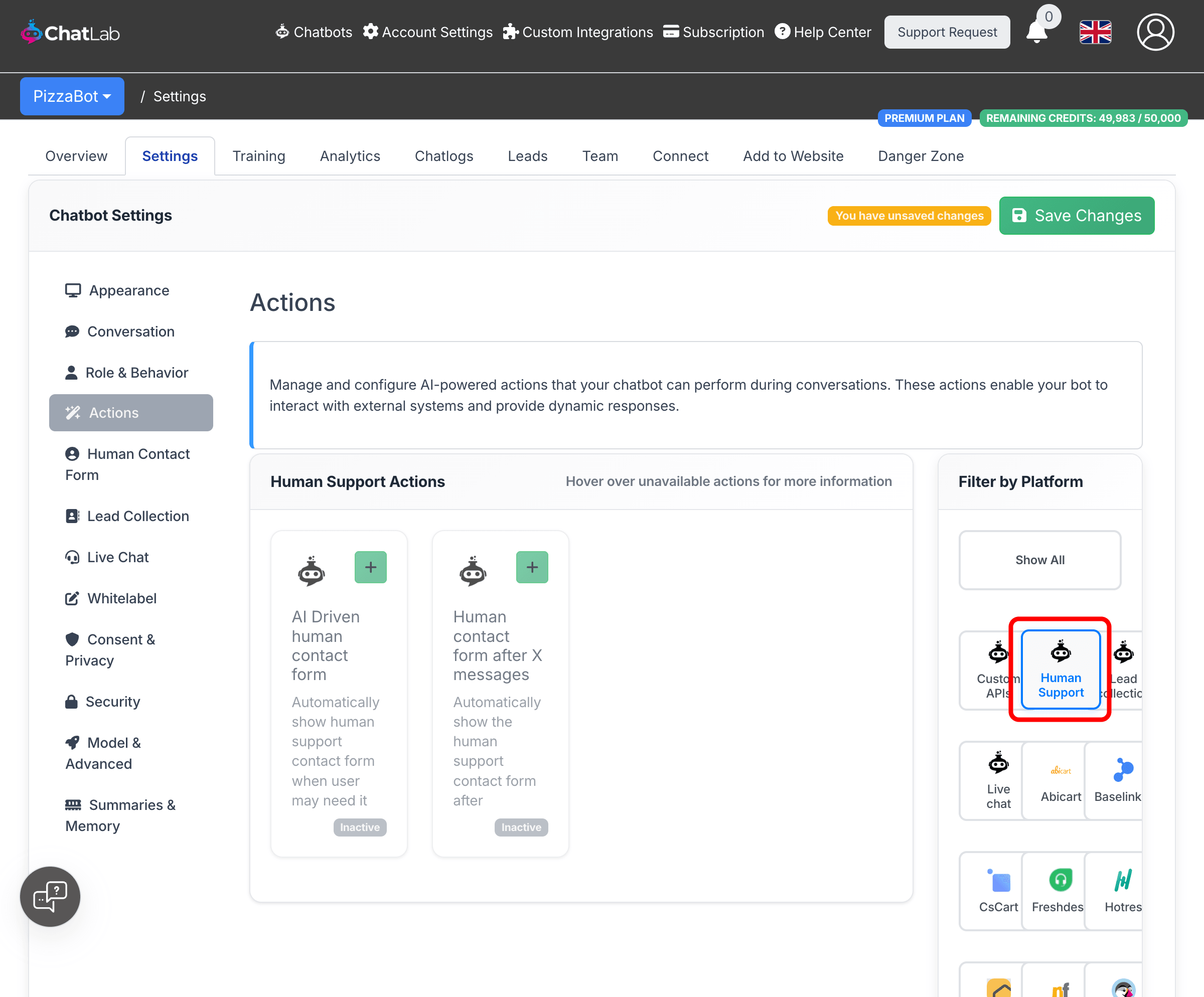 To configure automatic triggers, go to Settings > Actions and filter by Human Support.
