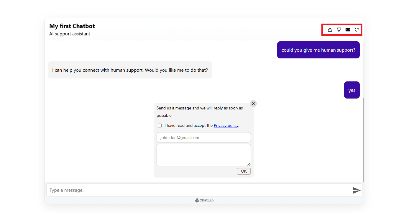 - AI Driven human contact form -- uses AI to detect when the visitor needs human assistance and automatically suggests the contact form. The form also appears when the visitor explicitly asks to speak with a person.