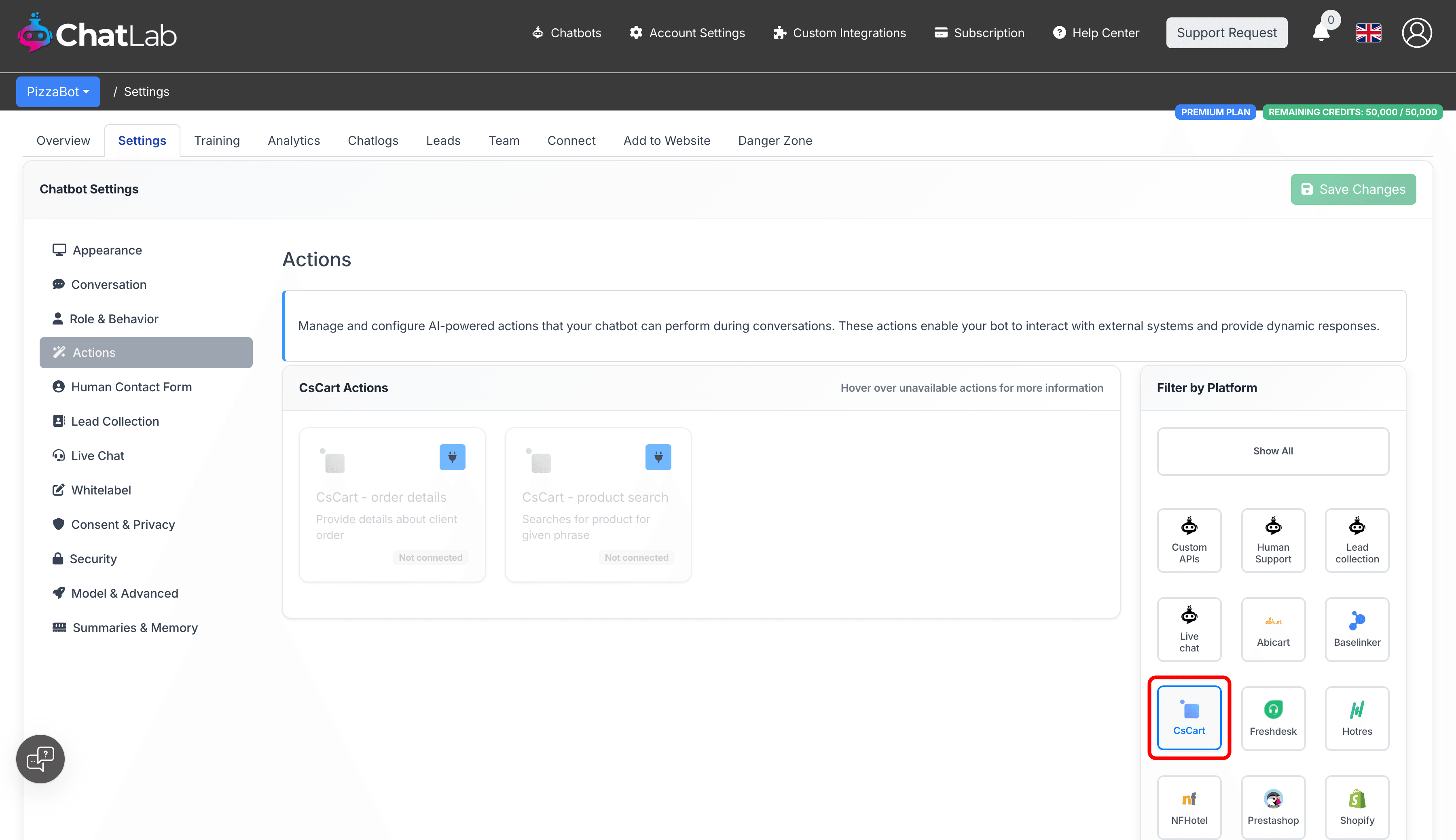 After connecting, enable and customize individual AI actions. Navigate to Settings > Actions and filter by the CsCart platform.