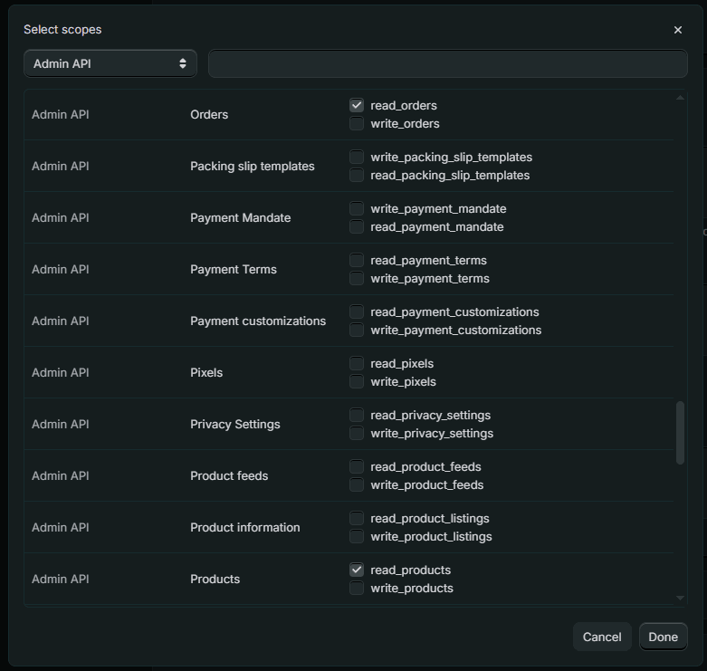- Under Admin API access scopes, find and enable these permissions: