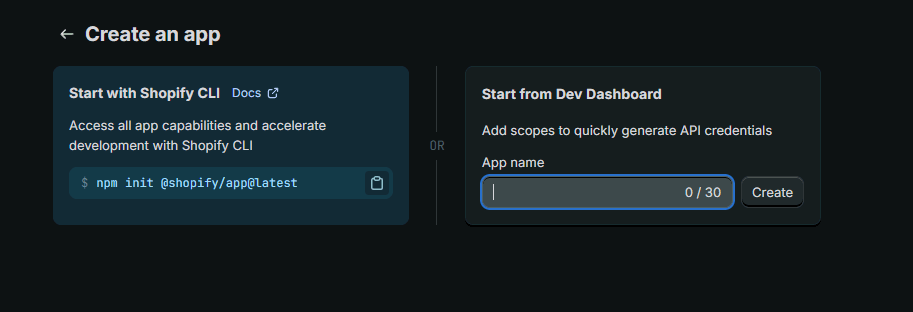 - On the App Development page, click Build apps in Dev Dashboard -- this opens dev.shopify.com/dashboard