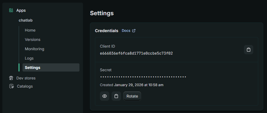 - Go to App settings and copy the Client ID and Secret -- store these securely, you will need them to connect with ChatLab