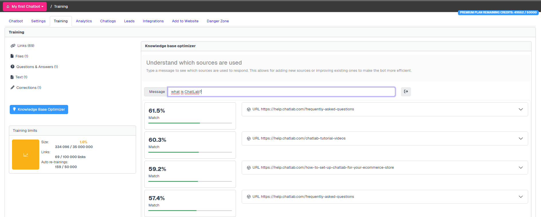 Now you can test if the knowledge base answers for your questions and which sources will be used for the response. ChatLab will use all the sources returned as the result of this search.
