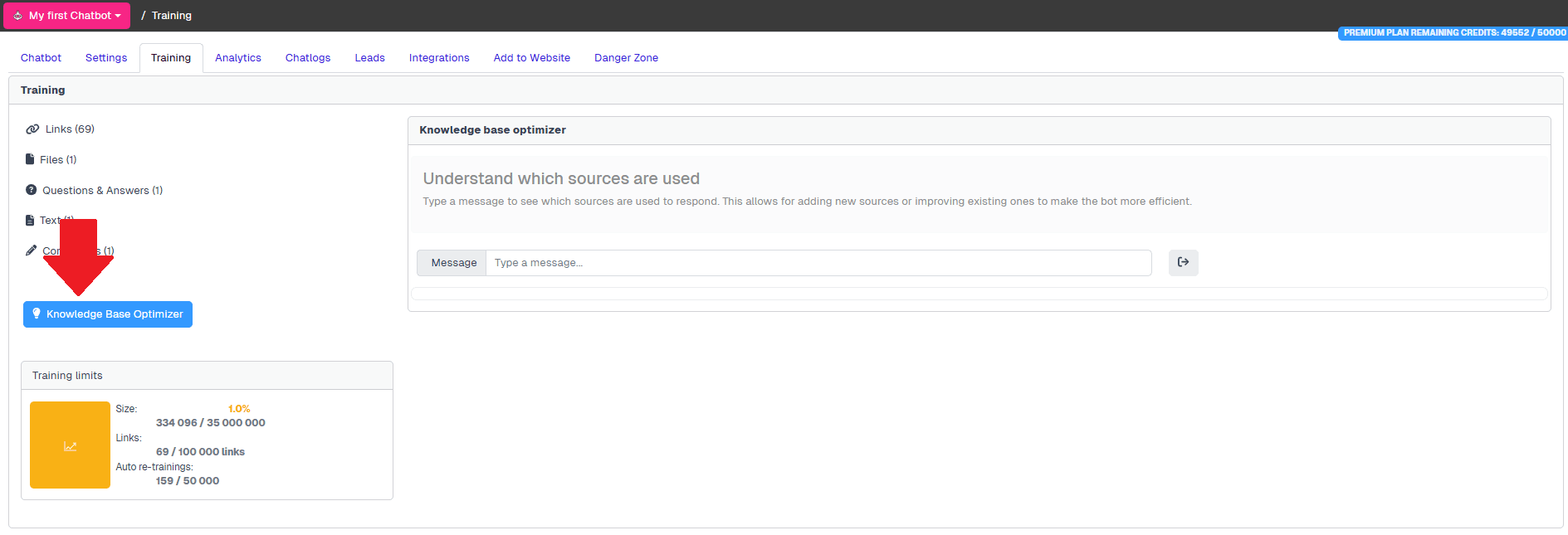 Select the chatbot on which you want to operate in the main chatbots dashboard, go to Settings tab and in the left menu select Knowledge Base Optimizer.
