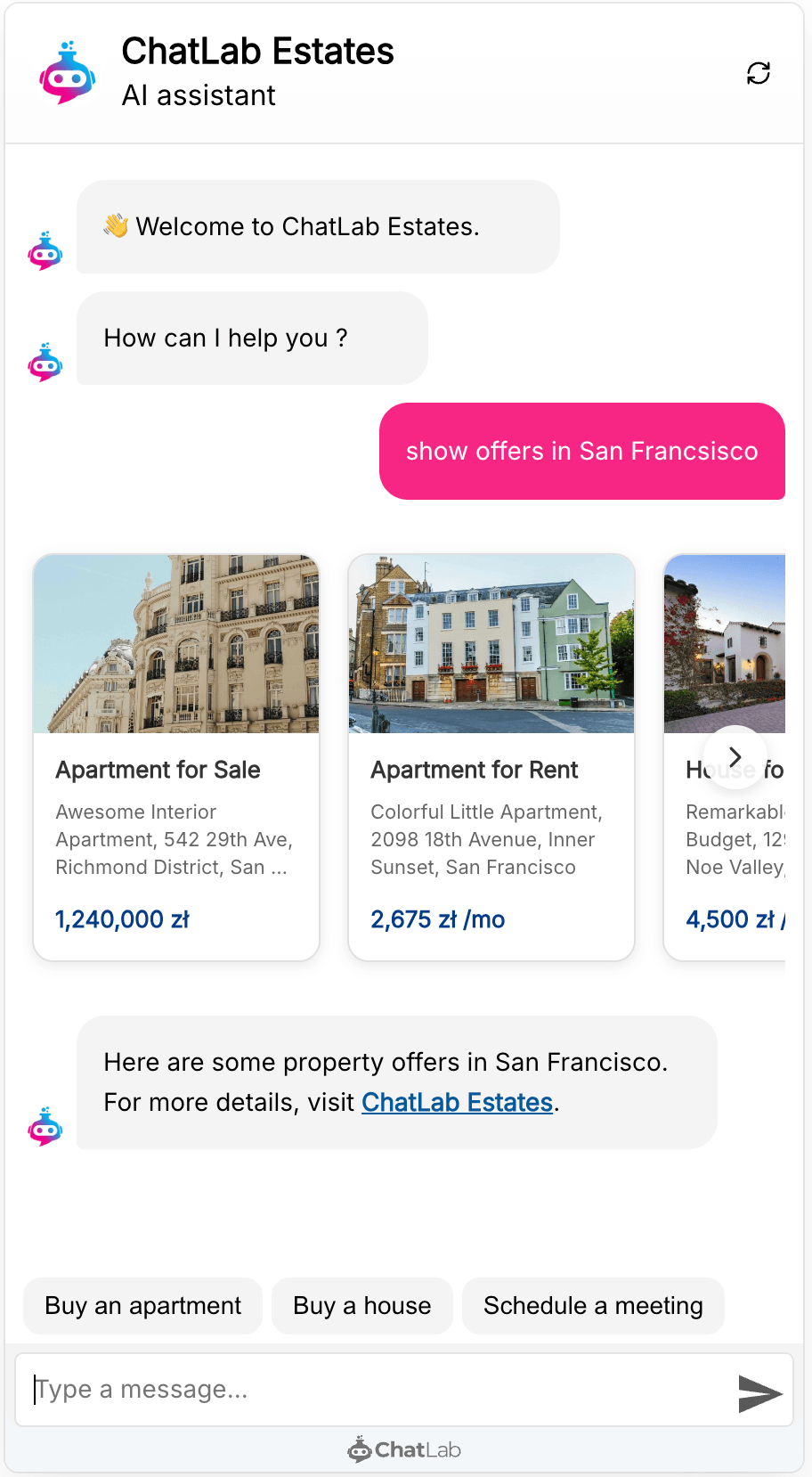 Without e-commerce integrations -- Products View also recognizes product-like content from your training data. If your website contains property listings, hotel rooms, service packages, or any structured offers, the chatbot presents them as cards when relevant.