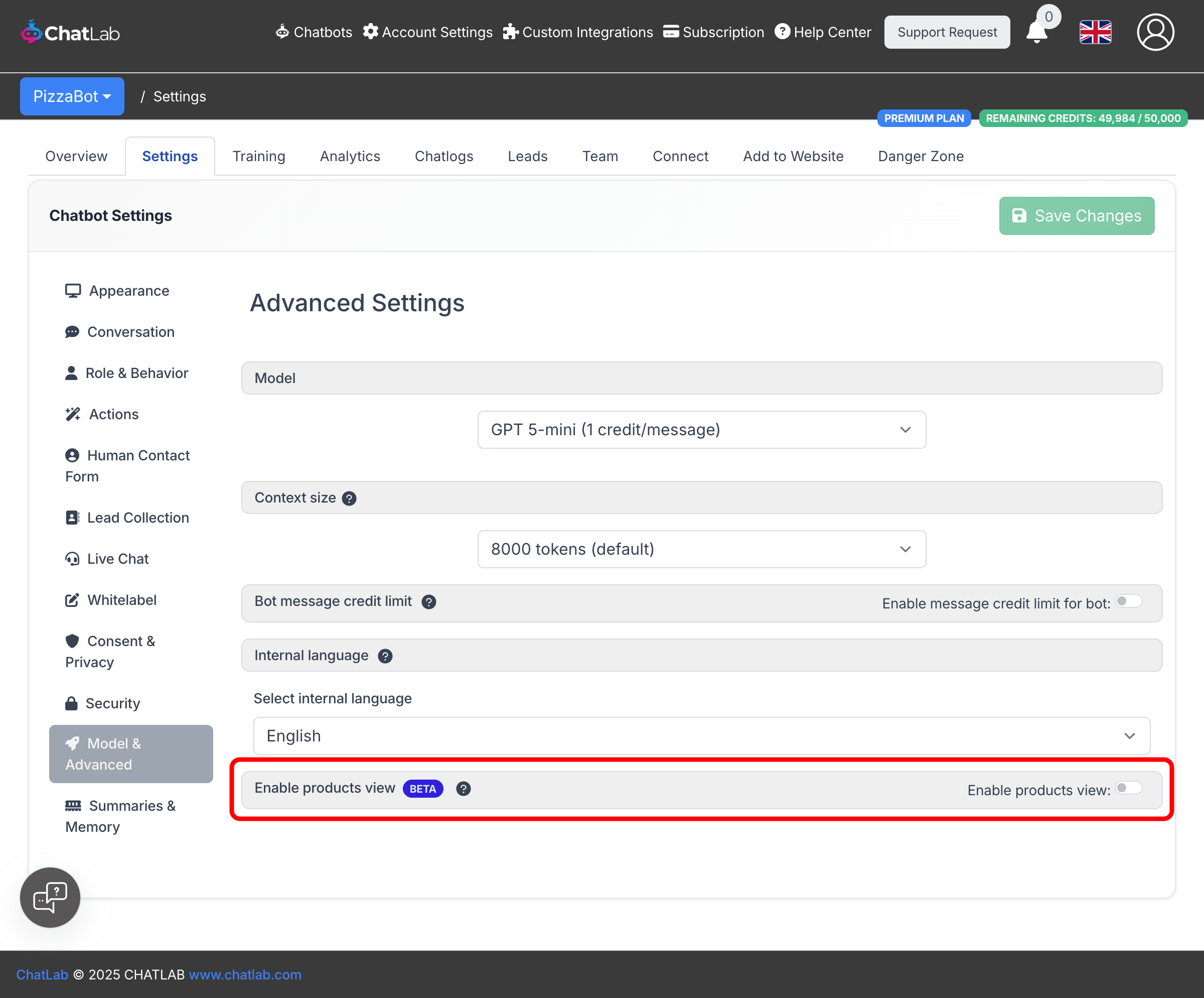 - Select your chatbot and go to Settings > Model & Advanced.