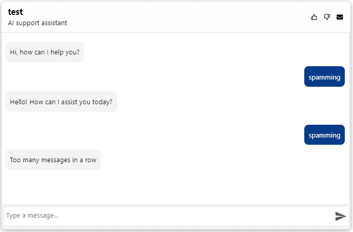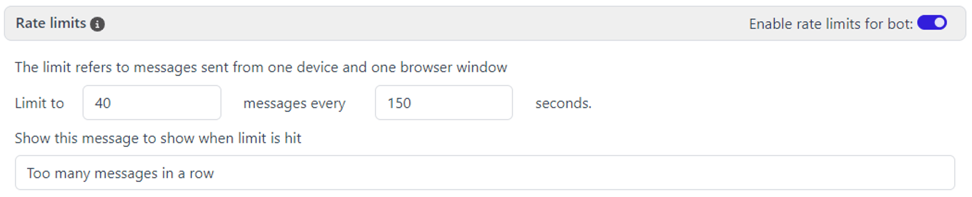 Rate limits help to protect your chatbot against malicious attacks that could use your message credits. When the rate limit is exceeded, the chatbot stops responding and displays the message.