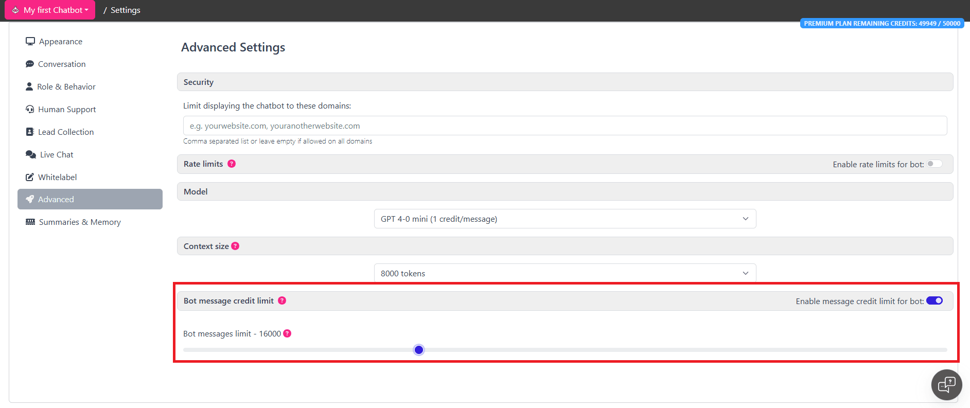 If you run multiple chatbots and you want to split your message credits beetwen the bots in explicit way, you can set the limit on each chatbot separetely. The sum of the limits cannot exceed the total credit message limits on your account.