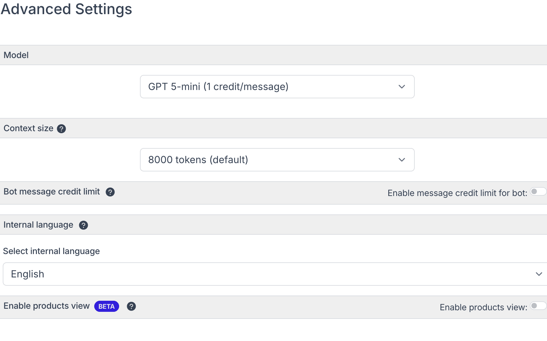 Note: Gemini models and GPT-4o models do not support dynamic suggested questions and products view features. If you have these features enabled and switch to an incompatible model, they will be automatically disabled.