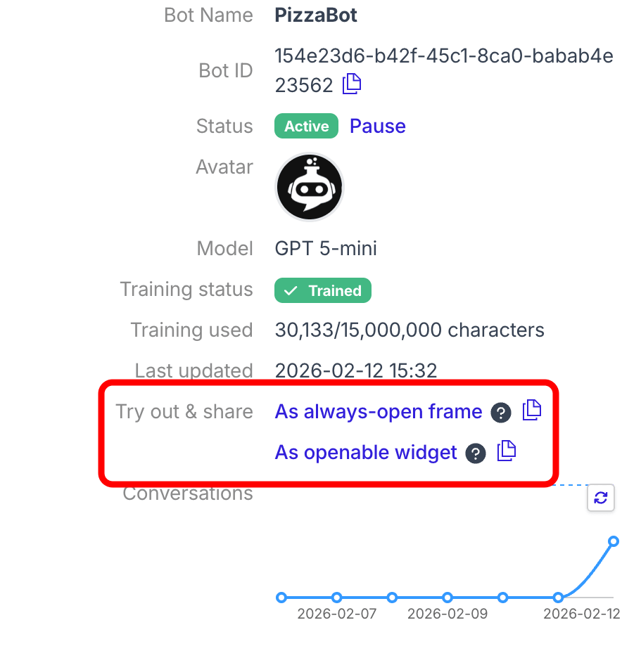 - Sharing links use your chatbot's live configuration. Any changes you make to settings, training, or appearance are reflected immediately for anyone using the link.