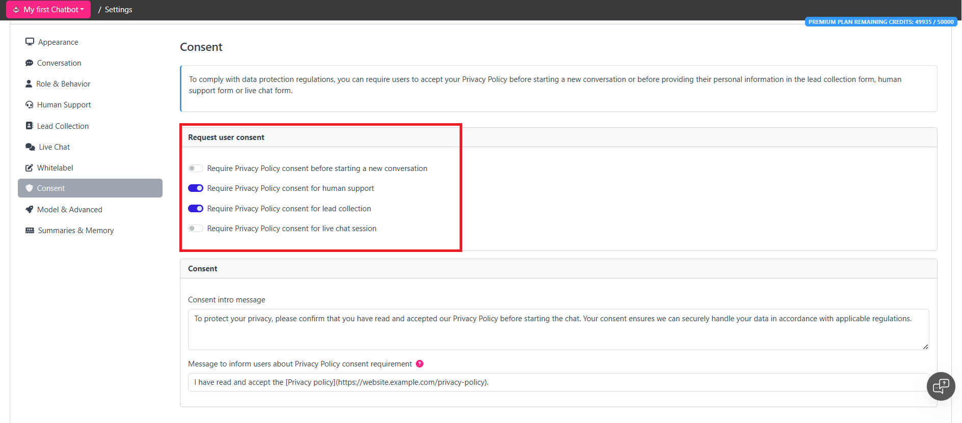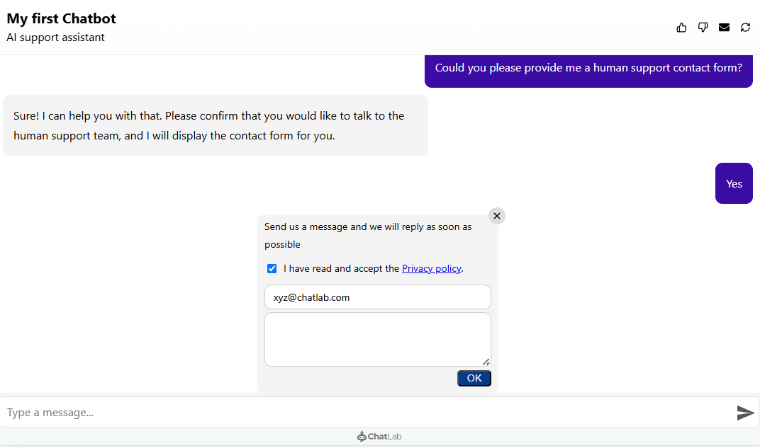 Nasze formularze zbierania leadów zawierają konfigurowalne pole wyboru, które, wraz z linkiem do Twojej polityki prywatności, wymaga od użytkowników wyrażenia wyraźnej zgody przed przesłaniem swoich danych. To proste dodanie wzmacnia przejrzystość i zgodność z prawem. Podobnie, włączenie zgody na Politykę Prywatności dla Wsparcia Ludzkiego zapewnia, że użytkownicy wyraźnie zgadzają się na Twoją Politykę Prywatności, zanim będą mogli poprosić o przekierowanie do agenta wsparcia ludzkiego w ramach czatu, co dodatkowo chroni prywatność użytkowników i przestrzega przepisów.