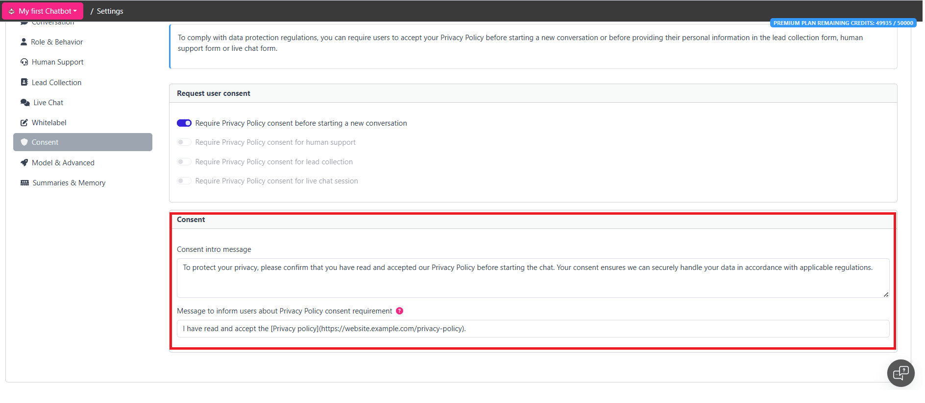 Łatwo połącz swoją politykę prywatności w interfejsie chatbota, aby informować użytkowników o tym, jak ich dane są przetwarzane.